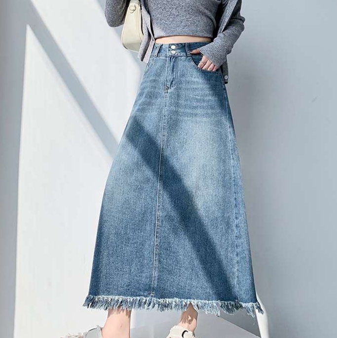 フリンジ裾がアクセントになった、すっきりとしたAラインのデニムスカート。